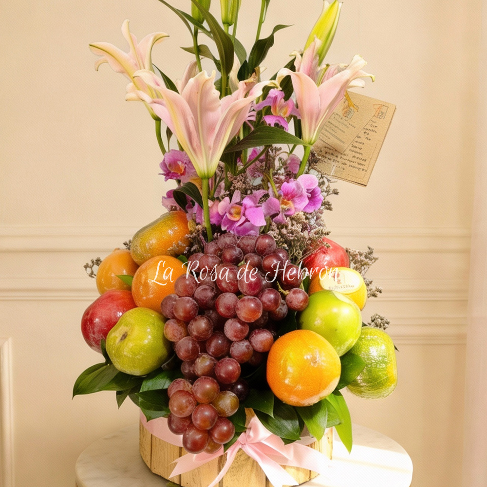 Los lirios elevan el diseño con su porte estilizado, mientras que la orquídea hawaiana añade un toque exótico y exclusivo. Las frutas convierten esta propuesta en un regalo gourmet ideal para sorprender con elegancia.