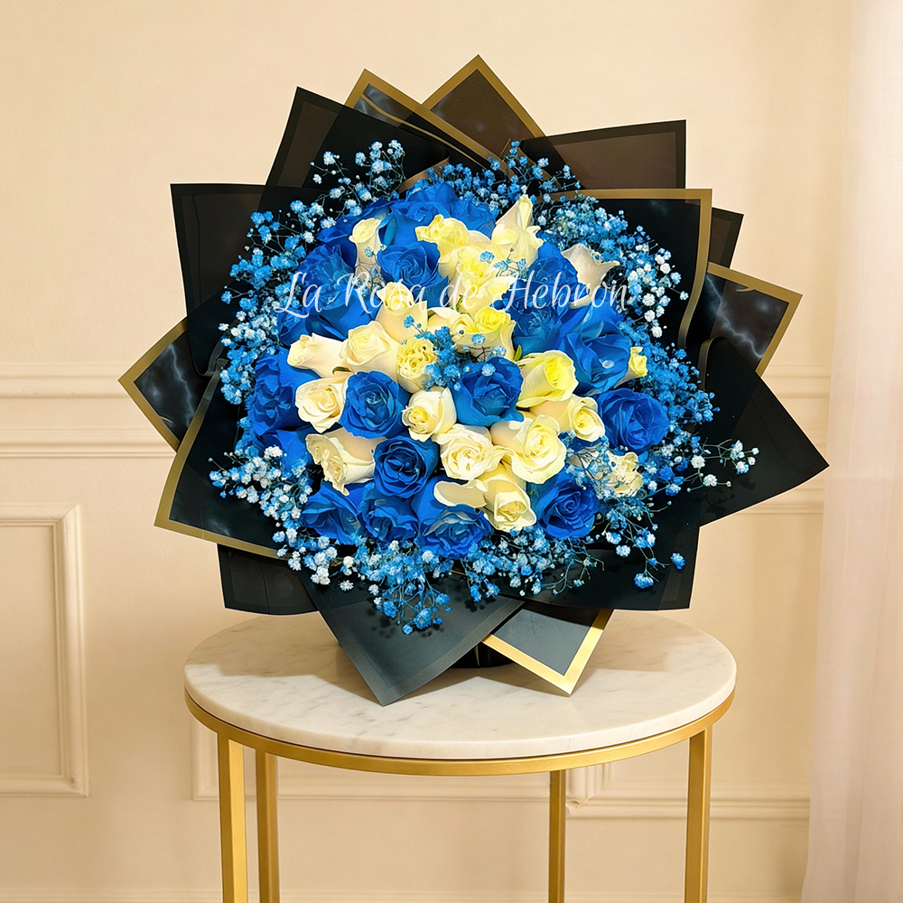 Las rosas azules simbolizan misterio, exclusividad y deseos especiales, mientras que las rosas blancas representan pureza y respeto. Esta combinación lo convierte en un arreglo ideal para sorprender de manera diferente y memorable.