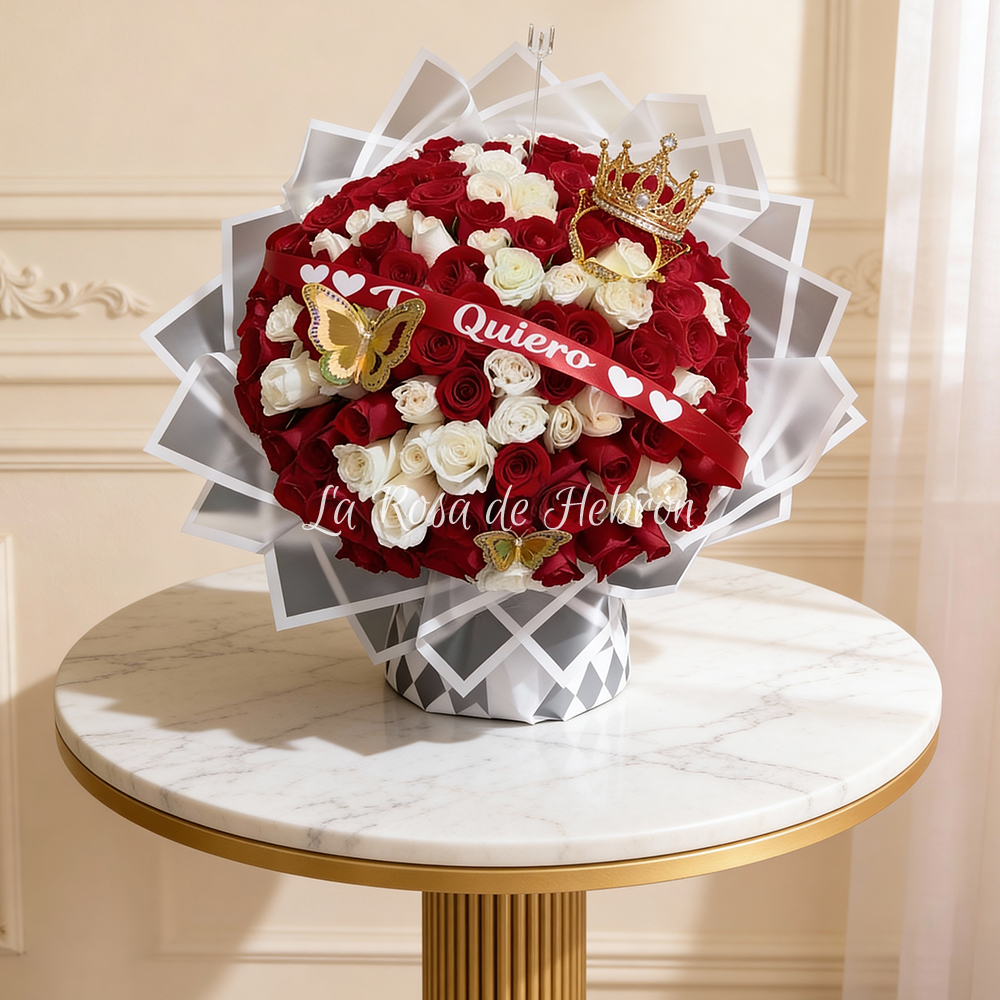 El Buchón de Rosas Pasión Real es un arreglo floral impactante que combina la intensidad de las rosas rojas con la pureza de las rosas blancas, creando una composición elegante, romántica y sofisticada.