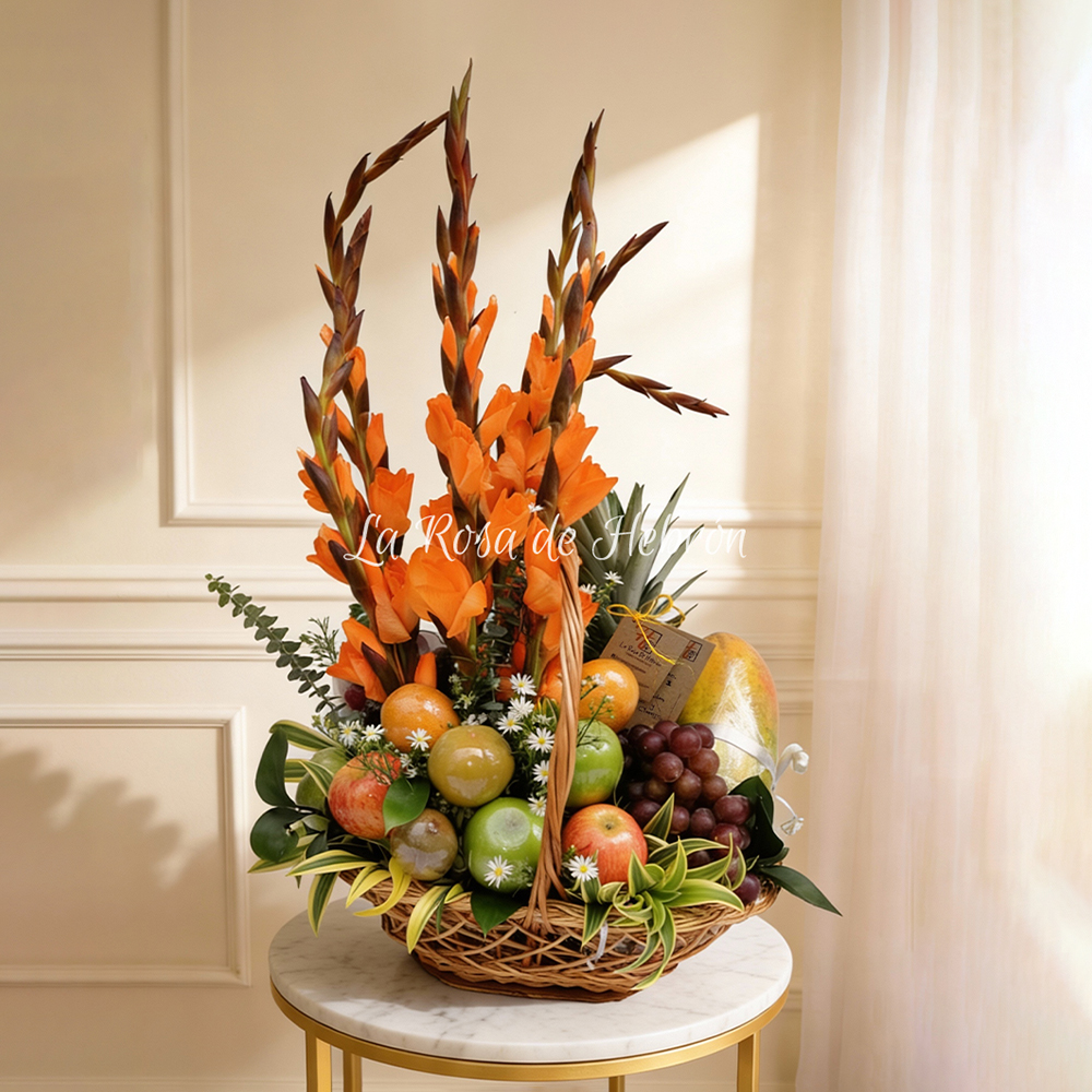 Presentado en base tipo canasta, este diseño reúne frutas como uvas, manzanas y cítricos que aportan color y textura, acompañadas de gladiolos en tonos naranja que elevan la composición con una estética moderna y llamativa. El follaje verde aporta equilibrio y profundidad, logrando una pieza armónica y sofisticada.