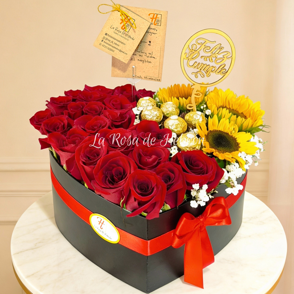 Las rosas rojas simbolizan amor y pasión, mientras que los girasoles representan alegría y admiración, convirtiendo este corazón de rosas en Cali en una opción perfecta para impactar y emocionar.