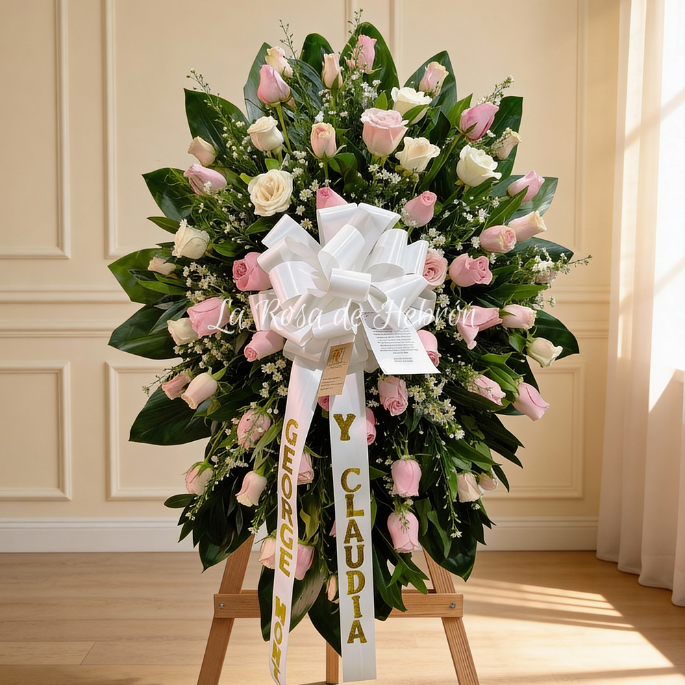 Este arreglo floral funerario está elaborado con rosas blancas y rosadas frescas cuidadosamente seleccionadas, acompañadas de follaje complementario que aporta volumen, equilibrio y elegancia natural. Su estructura redonda y armónica está montada sobre una base en madera tipo trípode, ideal para ceremonias religiosas, velorios y funerales en Cali.