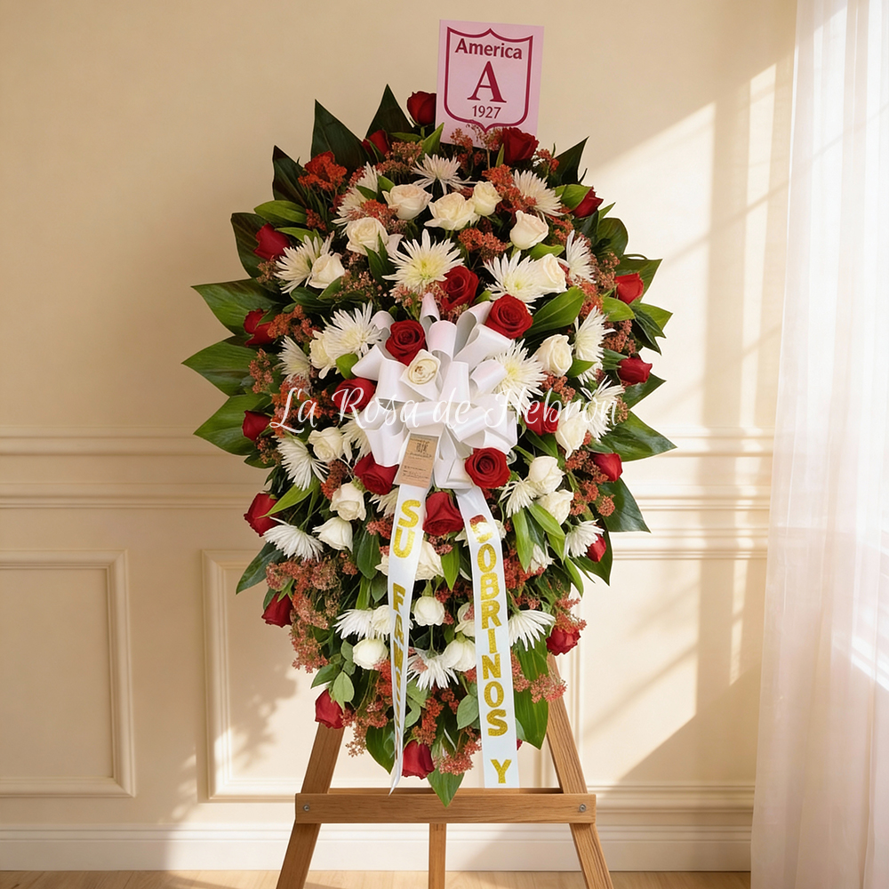 Está elaborada con una elegante combinación de rosas rojas frescas, símbolo de amor eterno y gratitud profunda, acompañadas de crisantemos blancos que representan paz, honor y descanso eterno. El follaje verde complementario aporta estructura, volumen y una presentación armónica y solemne.