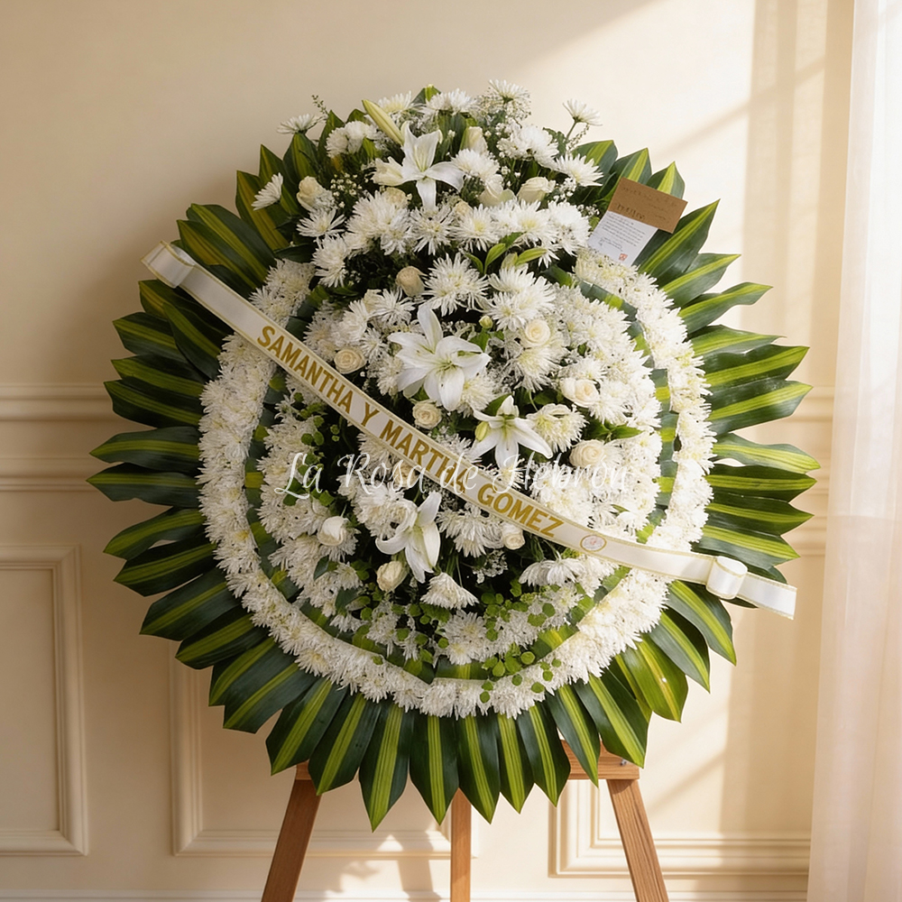 Elaborada con rosas blancas, crisantemos y lirios, esta corona destaca por su estructura completamente tapizada, que genera un acabado uniforme, elegante y solemne. Las flores blancas simbolizan paz, pureza y homenaje sincero, convirtiéndola en una opción adecuada para honrar la memoria de un ser querido.
